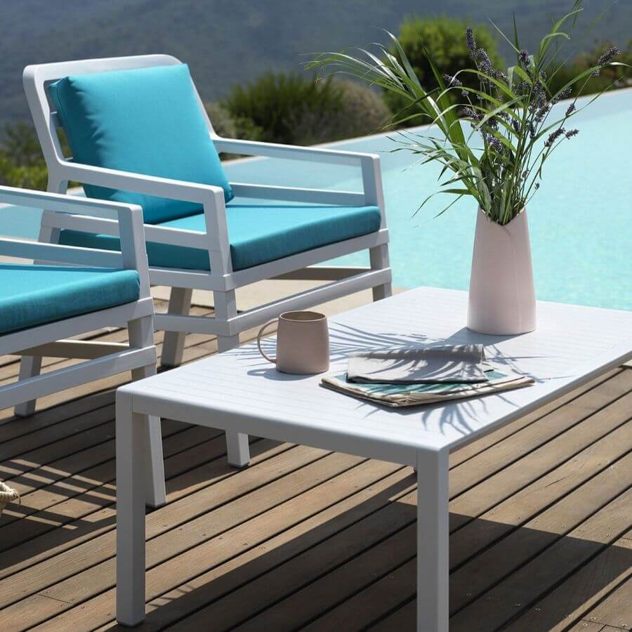 El Conjunto Jardín Nardi Sillón Aria+Mesa Aria está disponible en 3 colores de mesa: blanco, antracita y tórtora.